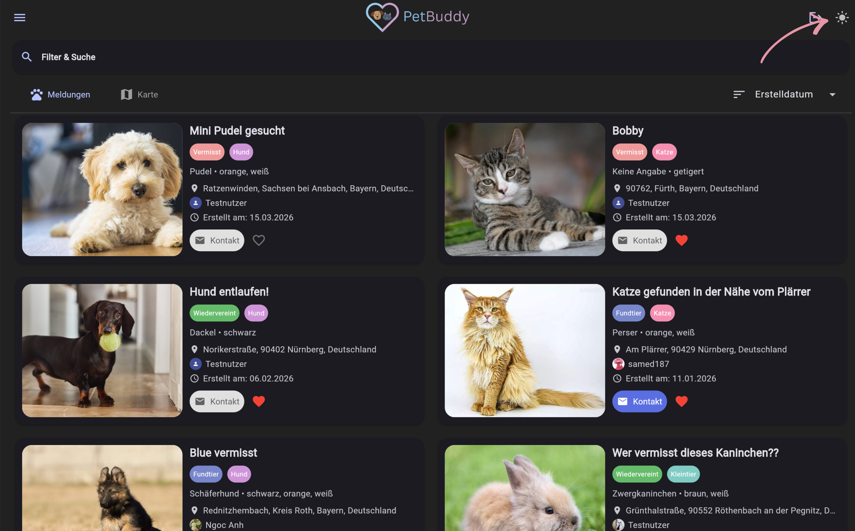 Klicken Sie auf das Sonnen-/Mond-Symbol in der AppBar, um zwischen Hell- und Dunkelmodus zu wechseln.