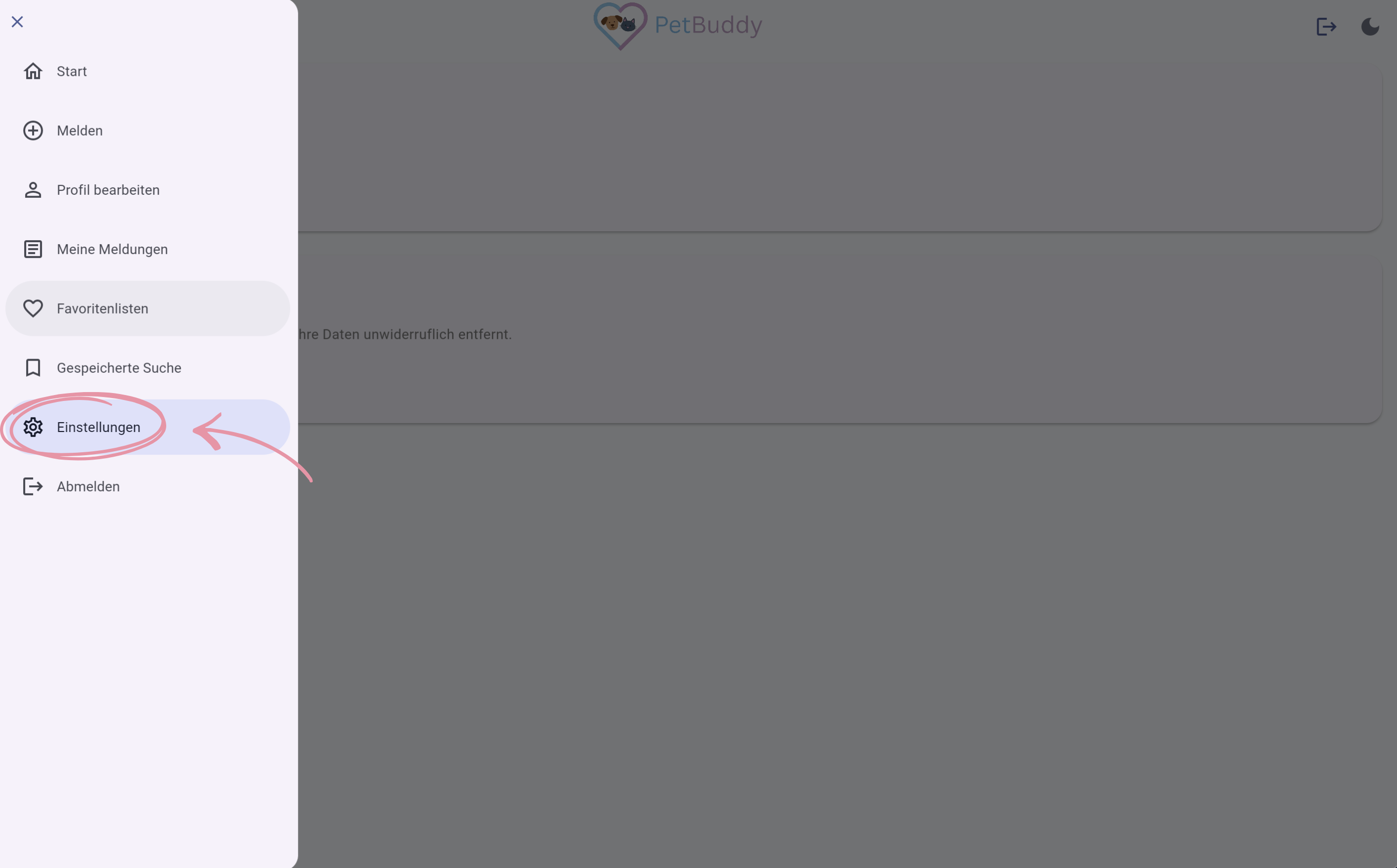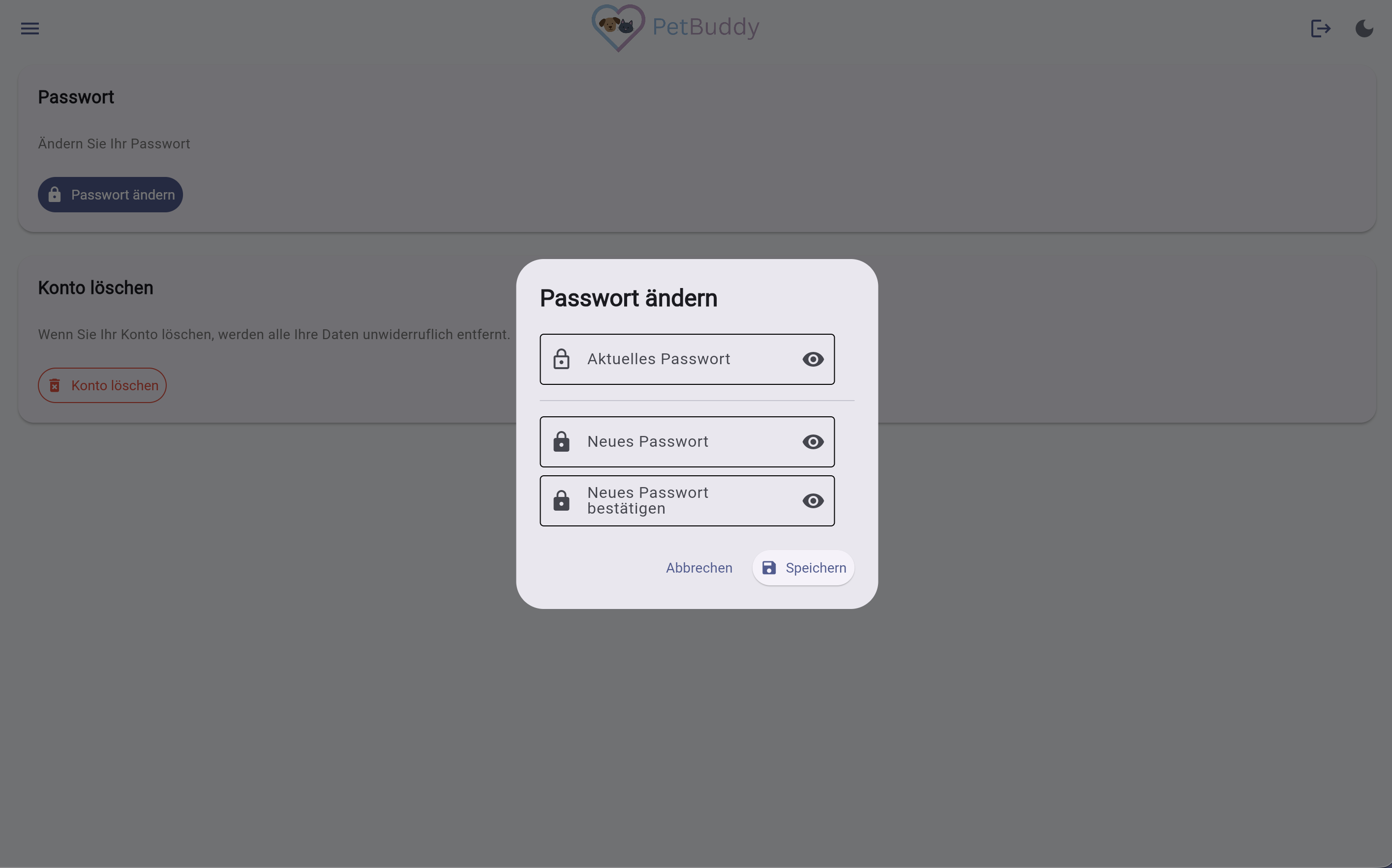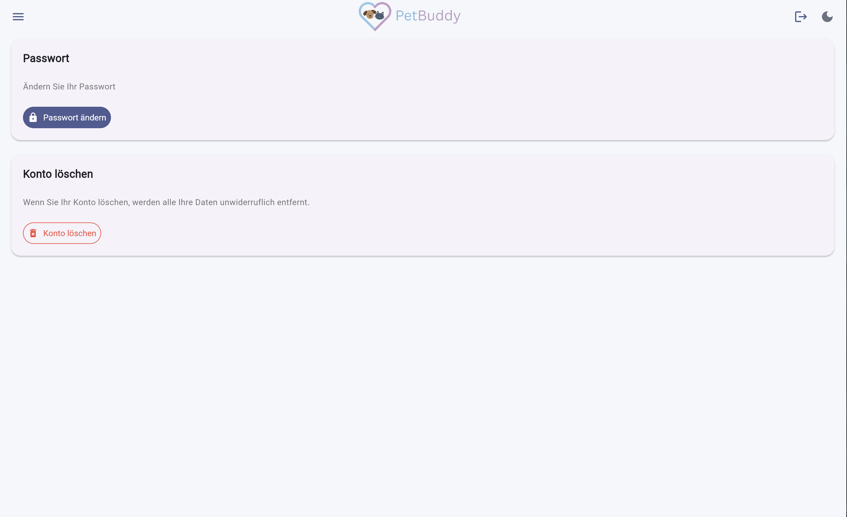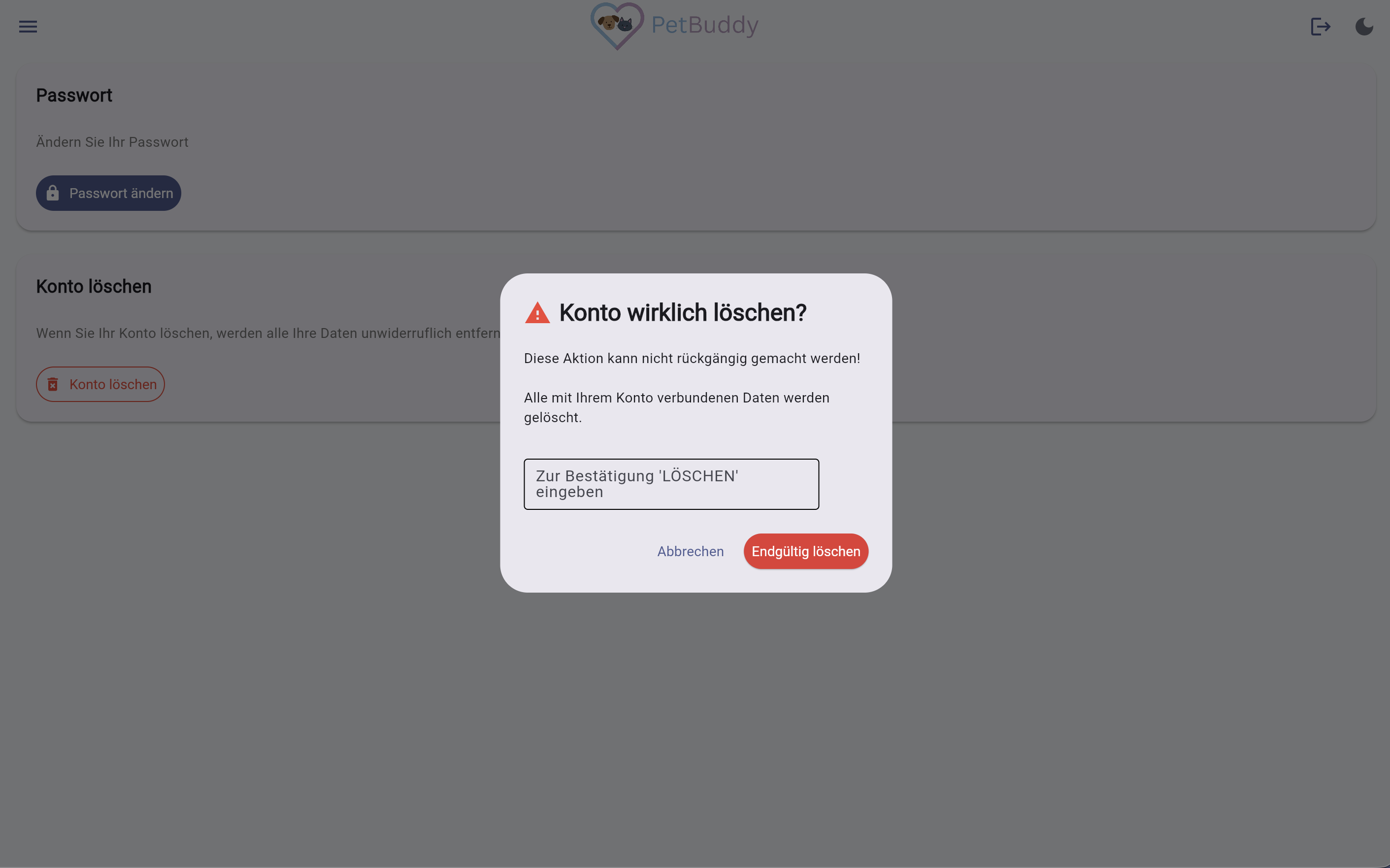 Um Ihr PetBuddy-Konto und alle damit verbundenen Daten dauerhaft zu entfernen, klicken Sie auf „Konto löschen" und bestätigen Sie den anschließenden Dialog.