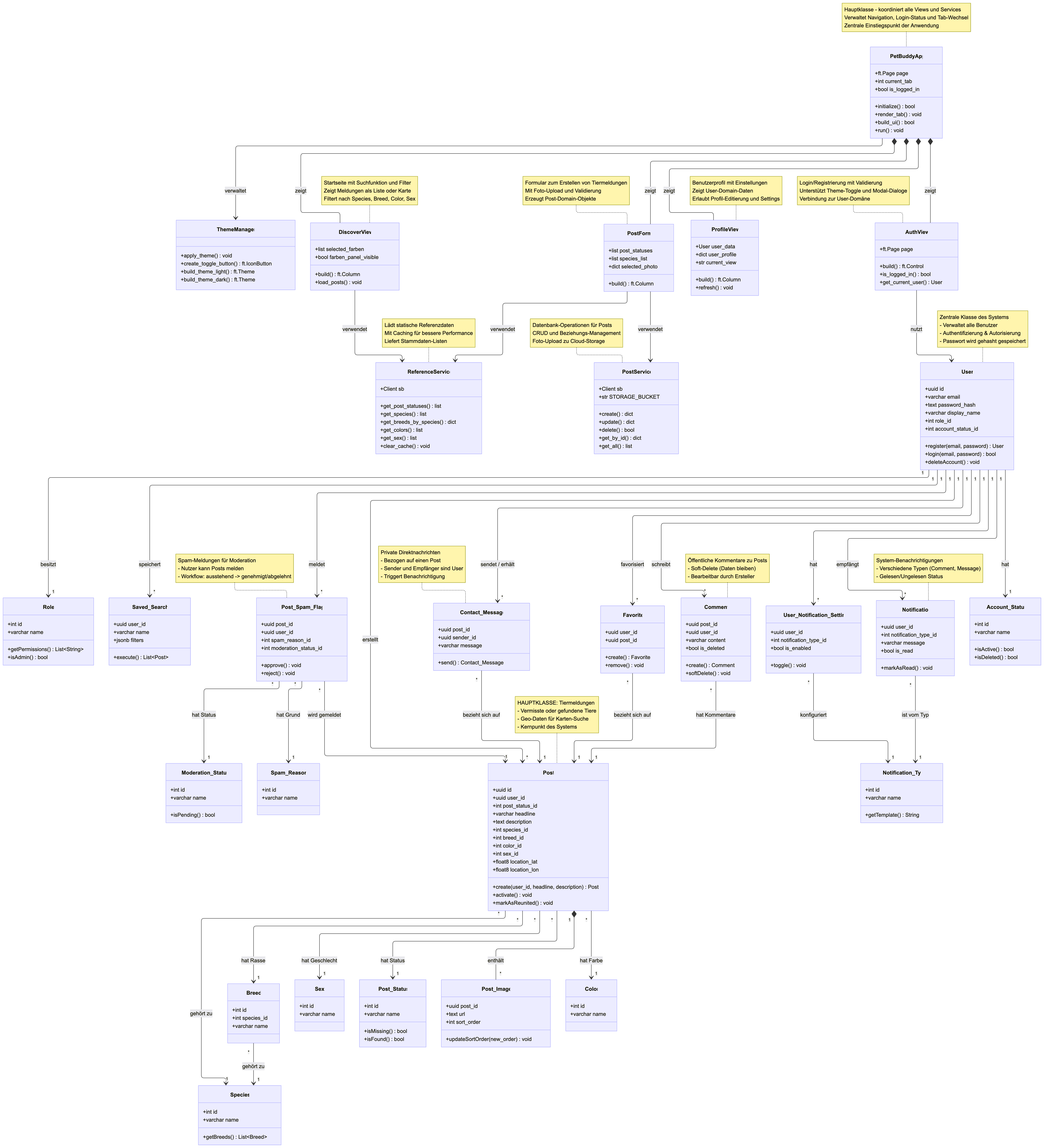 Alle Service-Klassen erhalten den Supabase-Client als Konstruktor-Parameter (sb). Dieser wird einmalig über get_client() in services/supabase_client.py erzeugt und von PetBuddyApp an die UI-Views weitergegeben, die ihn an die Services durchreichen.